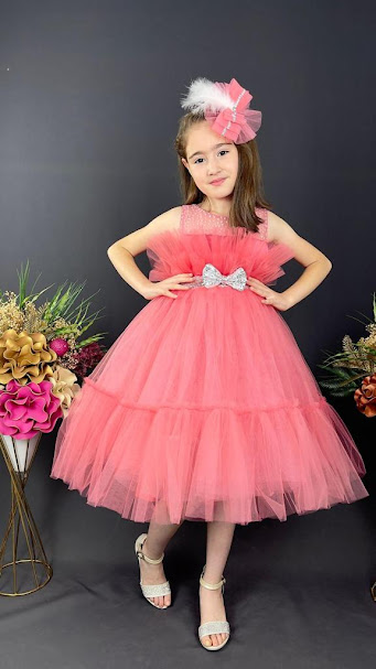 Elegantes lachsfarbenes Kinderkleid mit voluminösem Tüllrock und funkelnder Schleife.